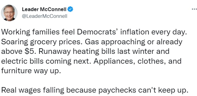 "Работающие семьи каждый день ощущают инфляцию демократов. Взлетают цены на продукты. Бензин приближается или уже выше 5 долларов за литр. Безудержные счета за отопление прошлой зимой и за электроэнергию следующей. Техника, одежда и мебель взлетают в цене. Реальная заработная плата падает, потому что зарплаты не поспевают за ценами", - пишет сенатор в Твиттере.