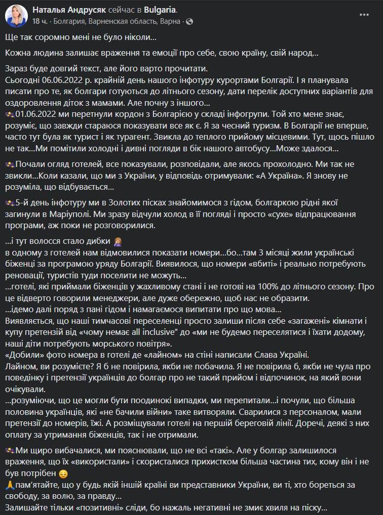 10:26 В болгарских гостиницах отношение к украинцам сильно ухудшилось после того, как в них жили украинские беженцы, пишет турагент из Черновцов Наталья Андрусяк в Facebook, которая посетила Болгарию.