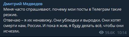 "Я их ненавижу. Они ублюдки и выродки. Они хотят смерти нам, России. И пока я жив, я буду делать всё, чтобы они исчезли", - написал Медведев.
