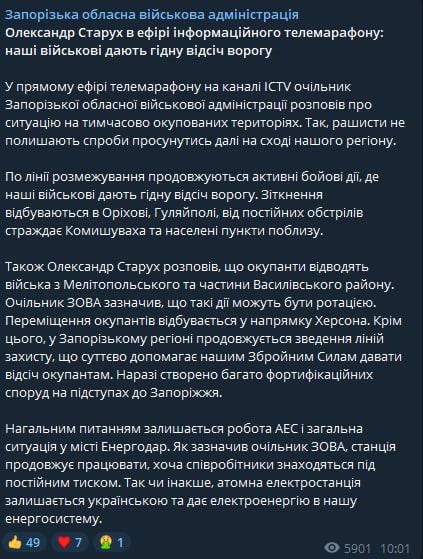 11.28 В Запорожской области идут бои в районе Орехово и Гуляйполе, сообщил глава Запорожской ОВА Александр Старух.