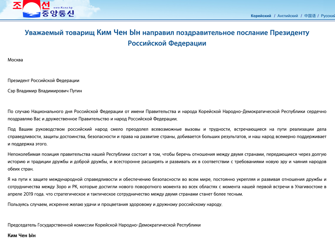 Об этом Ким Чен Ын написал в поздравительной телеграмме Путину по случаю Дня России, передает ЦТАК.