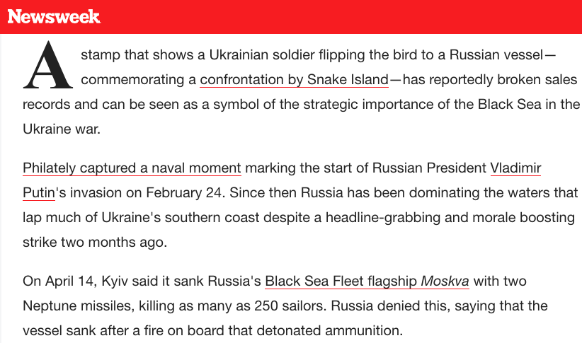 Представители британского военного ведомства обратили внимание на то, что в последующие после уничтожения крейсера "Москва" недели Россия перебросила несколько средств противовоздушной обороны на остров Змеиный, где ее военно-морские действия помогают блокаде украинского побережья. Президент Зеленский призвал увеличить количество противокорабельных ракет для прорыва блокады, предупредив на этой неделе, что к осени в Украине может застрять 75 миллионов тонн зерна. Однако есть сомнения, даст ли такое оружие преимущество Украине.