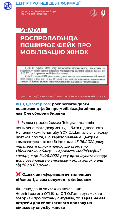 "Как недавно заявил начальник Черниговского ОТЦК и СП Гончарук сейчас нет необходимости обязательного призыва на военную службу женщин", - говорится в сообщении Центра противодействия дезинформации.