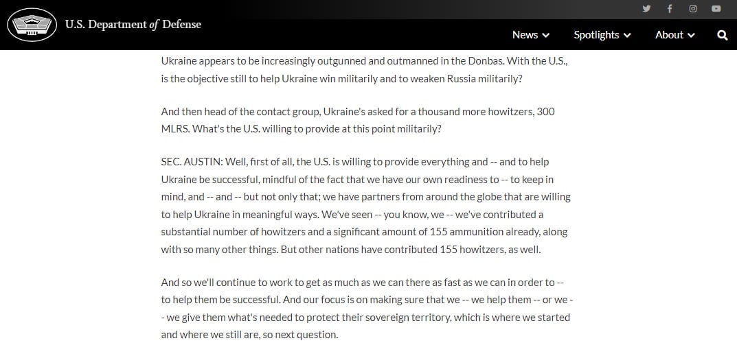 Министр обороны США Ллойд Остин ушел от прямого ответа на вопрос о том, будут ли США увеличивать поставки РСЗО и гаубиц Киеву. И как быть с тем, что Россия наступает на Донбассе.