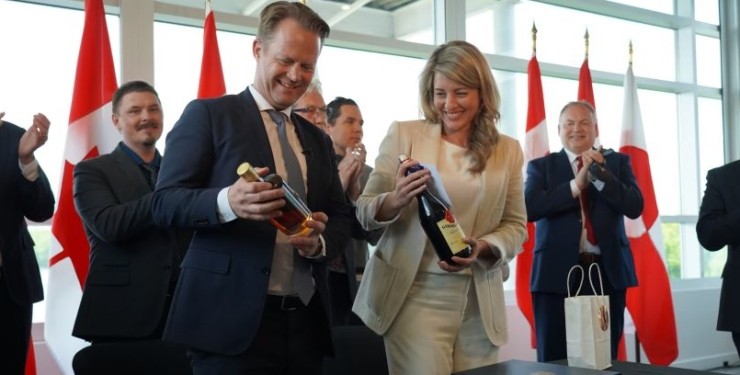 Главы МИД Дании и Канады обмениваются алкоголем. Фото: Justin Tang для globallookpress.com