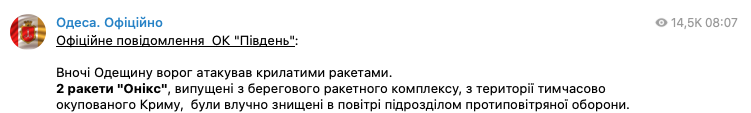"Ночью Одесщину враг атаковал крылатыми ракетами. Две ракеты "Оникс", выпущенные из берегового ракетного комплекса, с территории временно оккупированного Крыма, были точно уничтожены в воздухе подразделением противовоздушной обороны", - говорится в сообщении.