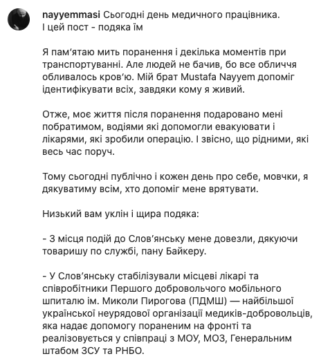 Найем благодарит всех, кто спас ему жизнь после ранения. Фото: instagram/nayyemmasi
