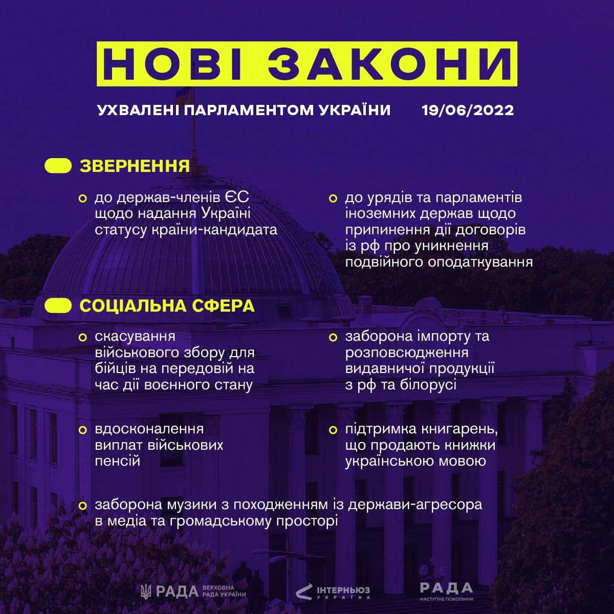 Верховная Рада на сегодняшнем заседании приняла ряд законопроектов. В частности, запретила российскую музыку и книги, а также обратилась к странам-членам Евросоюза касательно предоставления статуса кандидата в члены ЕС.
