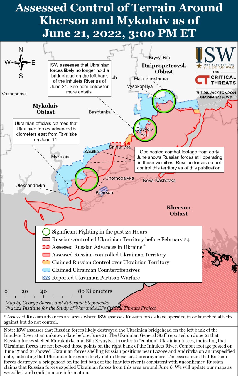 Также "Институт" фиксирует, что россияне скорее всего отбили восточный берег реки Ингулец недалеко от границы Херсонской и Николаевской областей.
