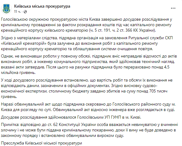 "Согласно материалам следствия, подрядная организация по заказу Ритуальной службы СКП "Киевский крематорий" была привлечена к выполнению работ по капитальному ремонту кремационного корпуса крематория и обустройству системы очистки воздуха. Однако, не выполнив работы в полном объеме, подрядчик внес ложные сведения в акты выполненных работ, а инженер коммунального предприятия, осуществлявший технический надзор, указанные акты утвердил. После этого на счета подрядчика было перечислено более 4,5 миллионов гривен. В ходе досудебного расследования установлено, что стоимость работ и объемы их выполнения не соответствуют данным, указанным в официальных документах", - говорится в сообщении прокуратуры.