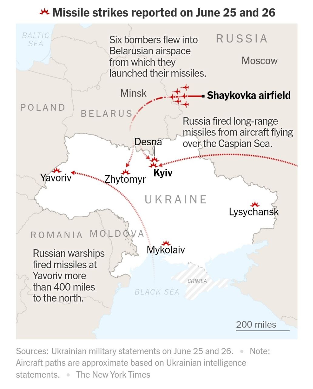 В Минобороны официально заявили, что по Украине отстрелялись российские стратегические бомбардировщики, которые вошли для этого в воздушное пространство Беларуси. Наглядно это изобразила газета The New York Times. Судя по ней, самолеты взлетели с российского аэродрома Шайковка и пустили ракеты через территорию Беларуси.