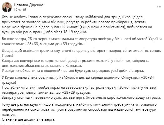 Об этом в Facebook пишет синоптик Наталья Диденко.