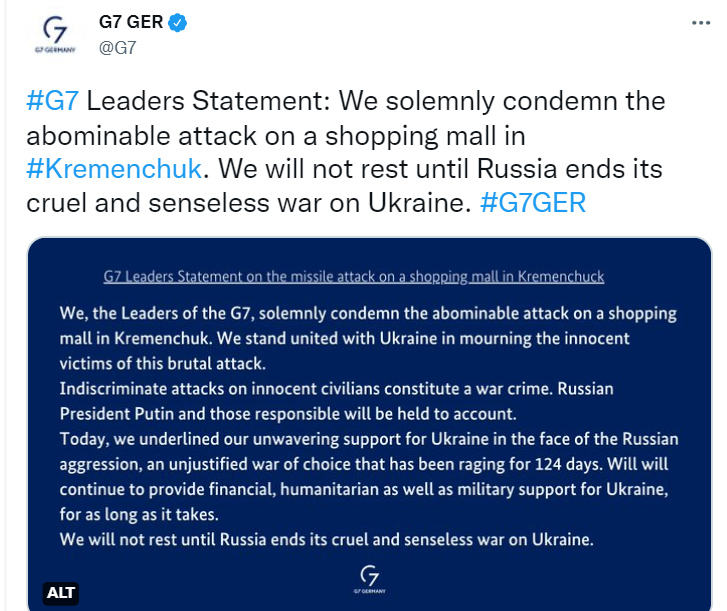 "Мы осуждаем гнусное нападение на торговый центр в Кременчуге", - говорится в заявлении стран "Большой семерки".