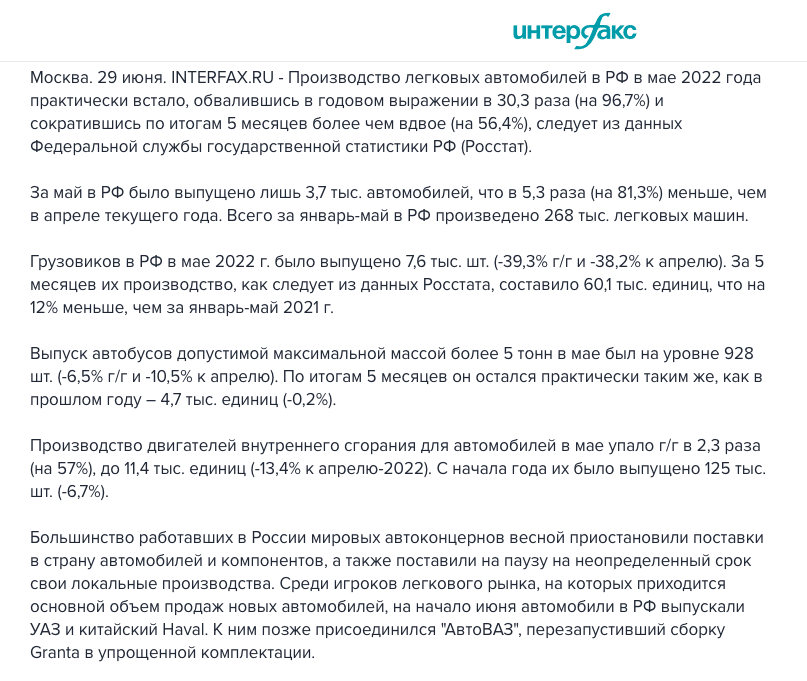 Согласно открытым данным, сейчас в России производят в 30 раз меньше легковых автомобилей, чем в 2021-м.