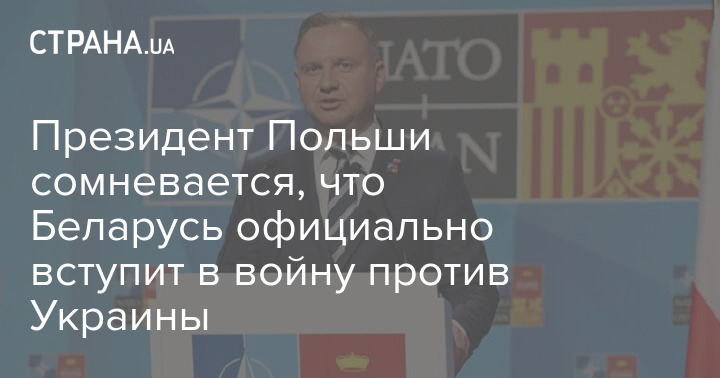 Президент Польши Анджей Дуда выразил сомнение, что Беларусь официально вступит в войну России против Украины. Об этом Дуда заявил, прибыв на саммите НАТО в четверг, сообщает "Европейская правда".