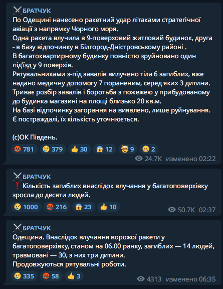 Спикер Одесской областной военной администрации Сергей Братчук сообщил попадании российской ракеты в жилой дом и базу отдыха в Белгород-Днестровском районе.