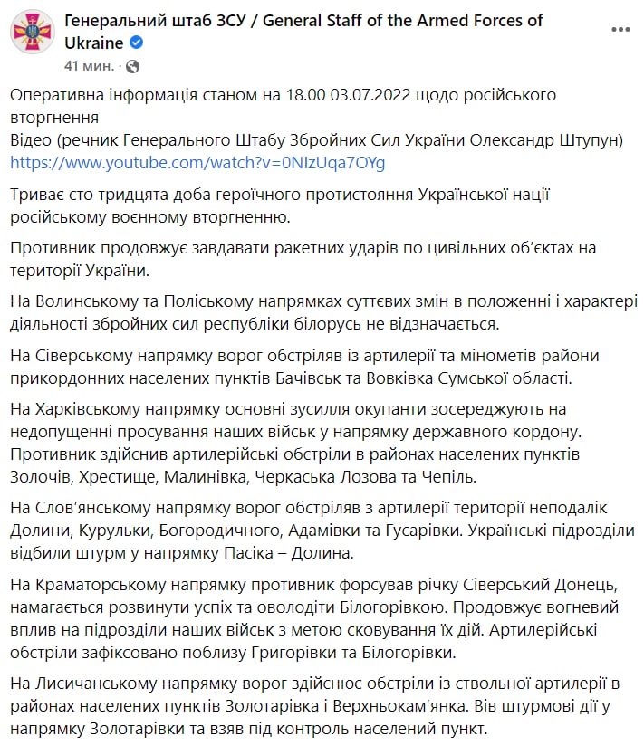 В воскресенье, 3 июля, в Украине идет уже 130-й день войны с Россией.