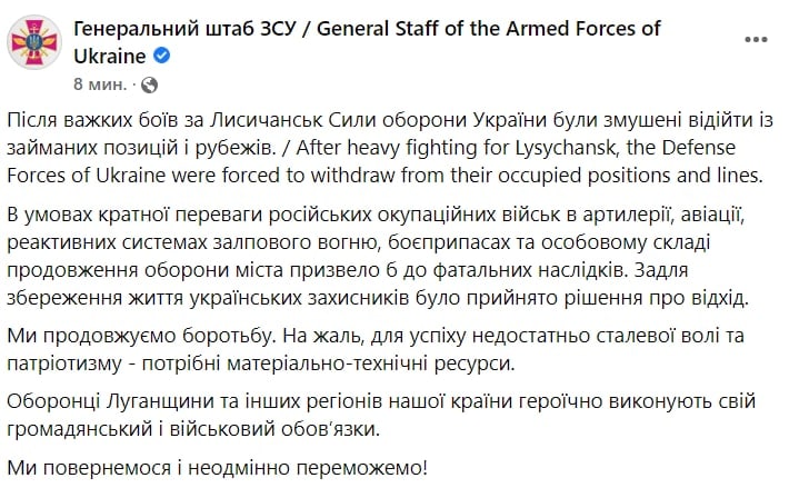 Напомним, что сегодня вечером Генштаб ВСУ официально заявил об отступлении украинских войск из Лисичанска.