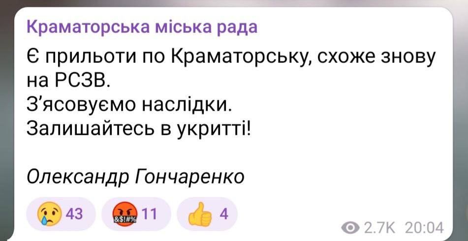 20.26 Мэр Краматорска заявил о новых прилётах в город из РСЗО.