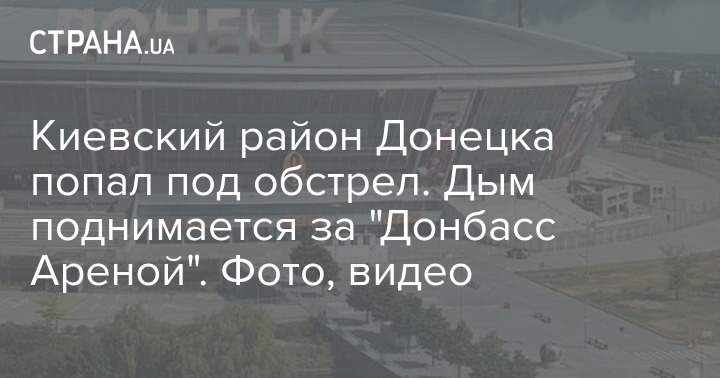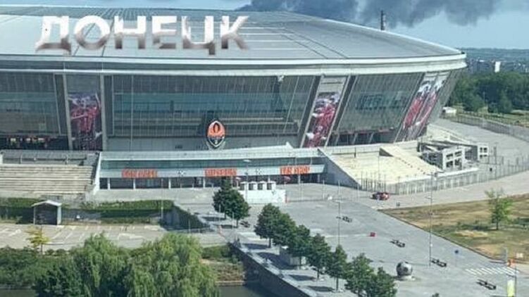 На кадрах виден черный дым, который поднимается над городом за стадионом "Донбасс Арена".