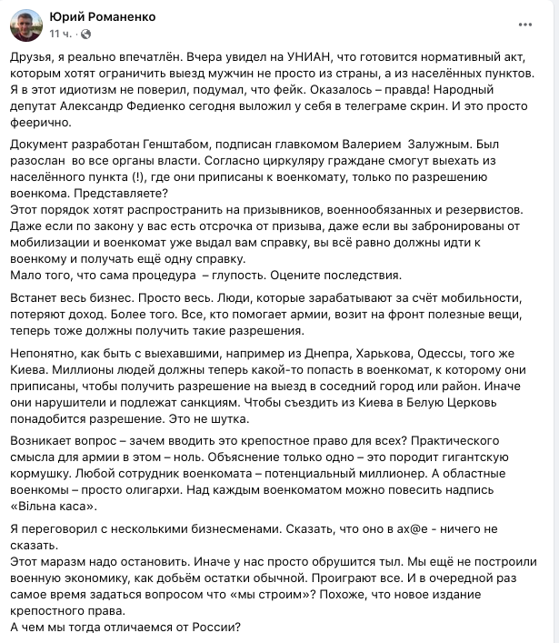 "Миллионы людей должны теперь как-то попасть в военкомат, к которому они приписаны, чтобы получить разрешение на выезд в соседний город или район. Иначе они нарушители и подлежат санкциям. Чтобы съездить из Киева в Белую Церковь понадобится разрешение. Это не шутка", - пишет он.
