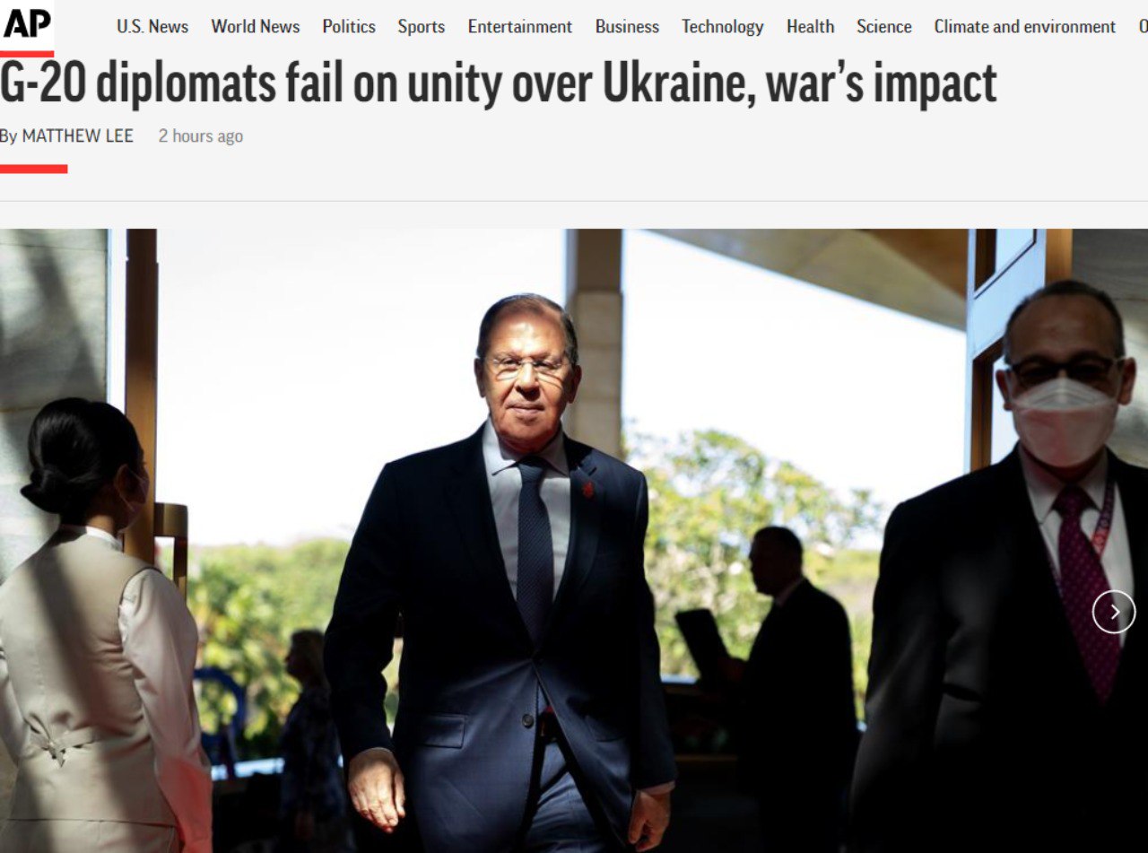 8.55 На саммите министров иностранных дел G20 на Бали отменили общее фотографирование. Это произошло из-за отказа ряда стран делать общий снимок с главой МИД РФ Сергеем Лавровым.