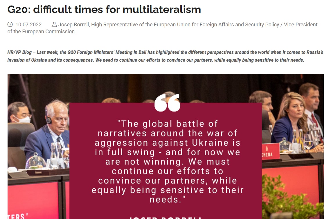 Представитель Евросоюза Жозепп Боррель разочарован тем, что большинство участников G20 отказались "назвать агрессора" в ситуации вокруг Украины.