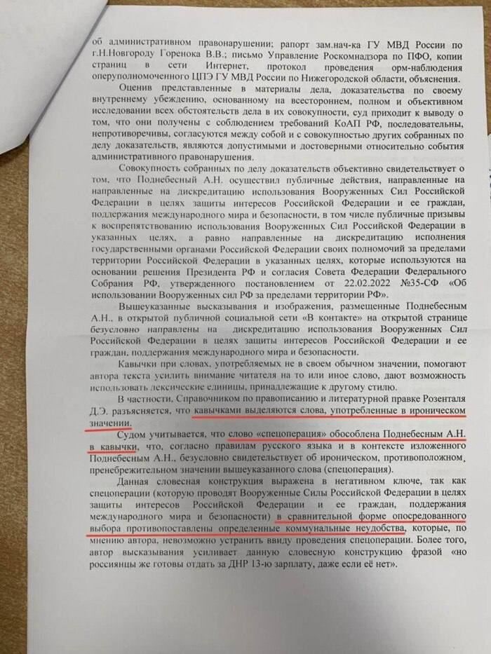 "Судом учитывается, что слово "спецоперация" обособлена Поднебесным А.Н. в кавычки, что согласно правилами русского языка и в контексте изложенного свидетельствует об ироническом, противоположном, пренебрежительном значении указанного слова", - говорится в решении суда.