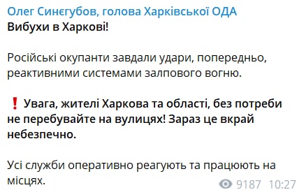 10:36 По Харькову нанесли удар из ракетных систем залпового огня, сообщил губернатор области Олег Синегубов.