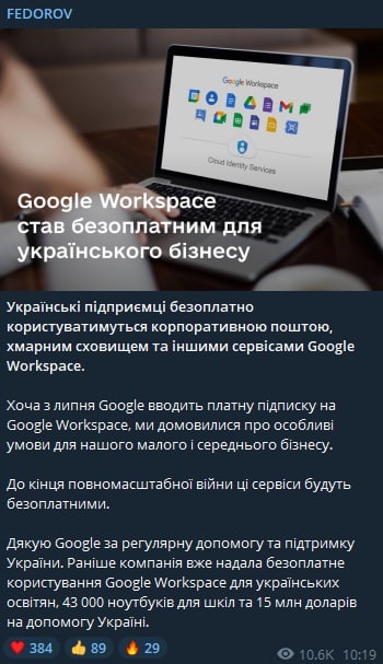 10:46 До конца войны сервисы Google Workspace (почта, облачное хранилище и т.д.) для малого и среднего бизнеса Украины будут бесплатными.