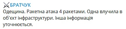 11.43 Ракетный удар по Одесской области. Одна из четырех ракет попала в объект инфраструктуры, сообщил спикер военной администрации Сергей Братчук.
