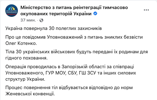 Украина вернула тела 30 погибших военных, и теперь они будут переданы их семьям для достойного захоронения.