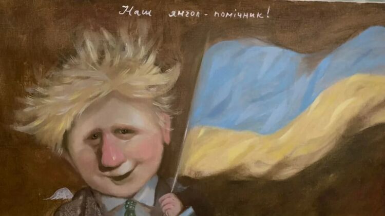 На новой картине Джонсон изображен в образе мальчугана с крылышками, с взъерошенными волосами. Он держит украинский флаг и улыбается. Над ним подпись "наш ангел-помощник".