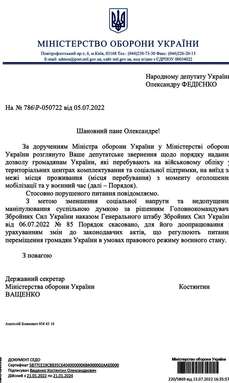 Военные пишут депутату, что, по решению главнокомандующего ВСУ, этот порядок дорабатывается "с учетом изменений к законодательным актам".