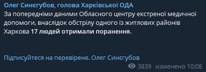 10:16 По данным центра экстренной медпомощи, из-за обстрела Харькова ранены 17 человек.
