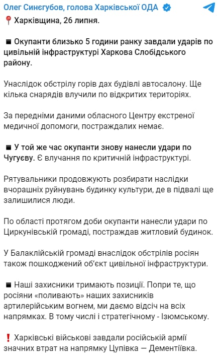 08:00 Сводка украинского Генштаба на утро 26 июля. Главное: