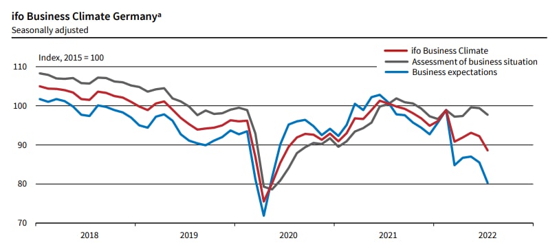 Давление на экономику оказывают высокие цены на энергоносители и надвигающаяся нехватка газа. Ухудшение настроений фиксируется в промышленном секторе, сфере услуг, торговле, строительной отрасли. Из чего ifo делает вывод о надвигающейся рецессии.