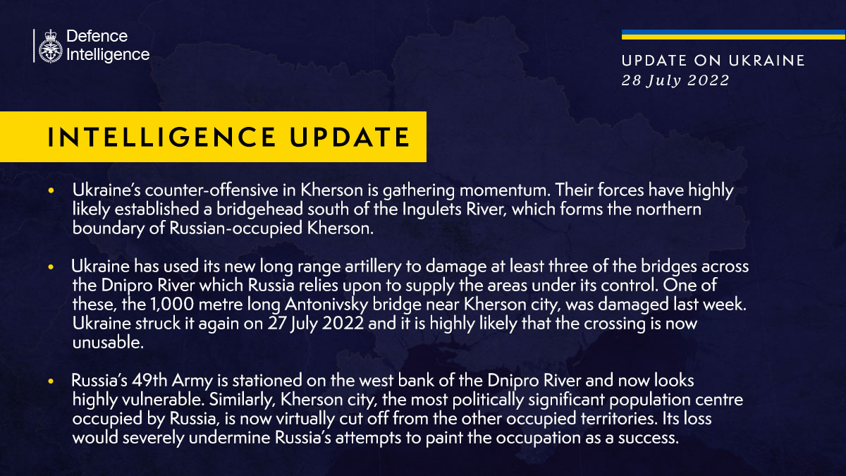 Один из них, 1000-метровый Антоновский мост под Херсоном, был поврежден на прошлой неделе, а после повторного удара ВСУ 27 июля он, весьма вероятно, сейчас непригоден, сообщает разведка.