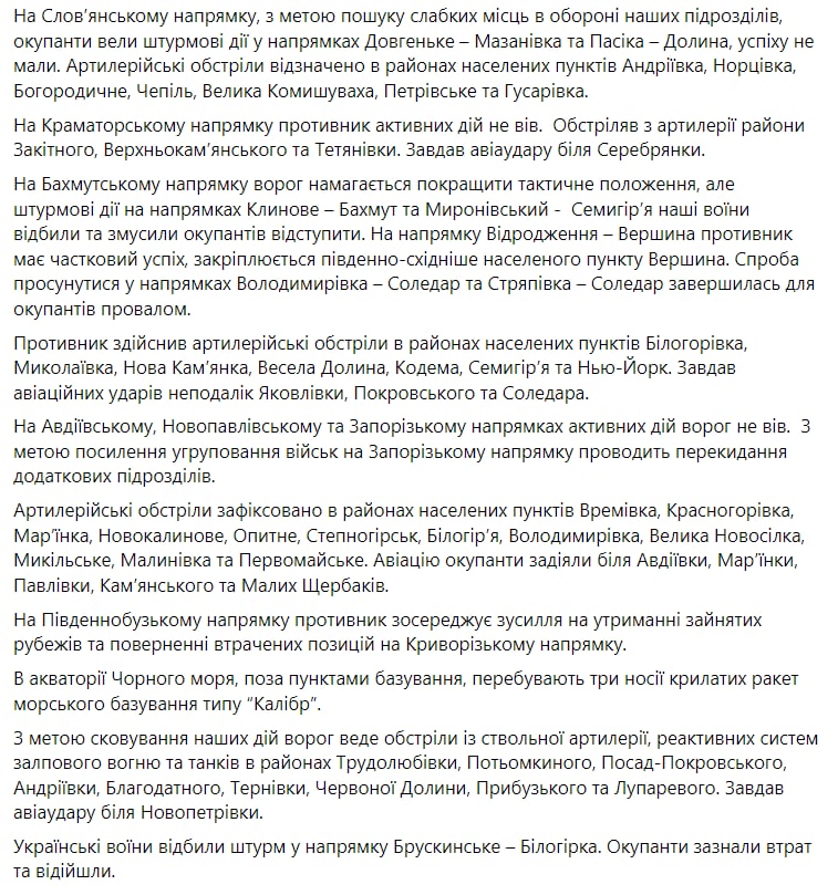 Южнее Бахмута противник вел штурмовые действия по направлениям Клиново – Бахмут и Мироновский – Семигорье. Оба штурма были отбиты.