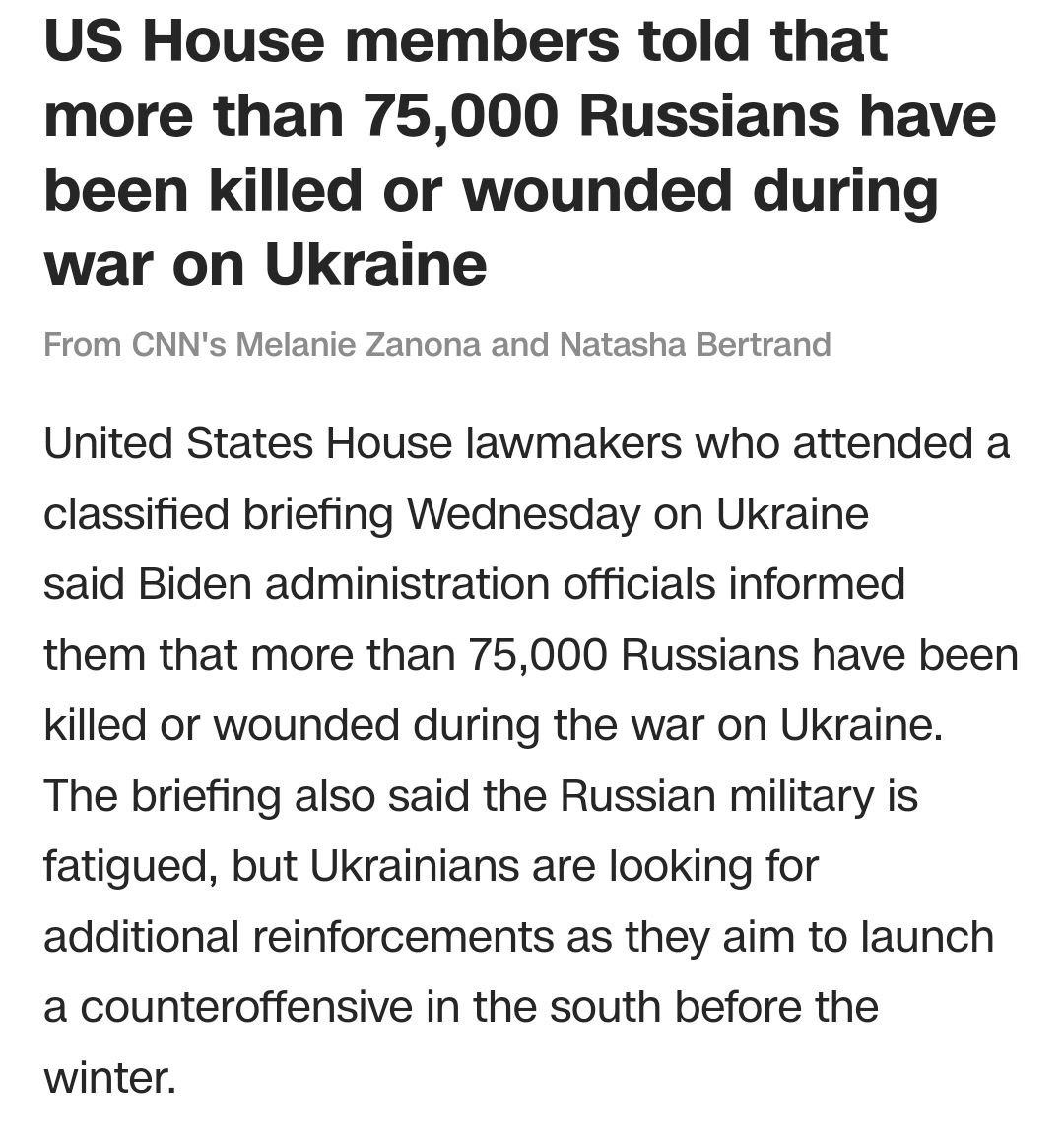 08:06 Россия потеряла убитыми или ранеными в Украине более 75 000 человек, сообщила CNN конгрессвумен Элисса Слоткин из комитета по обороне.
