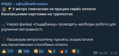 09:27 В метро Киева временно не работает сервис оплаты банковскими картами на турникетах, сообщают в КГГА.