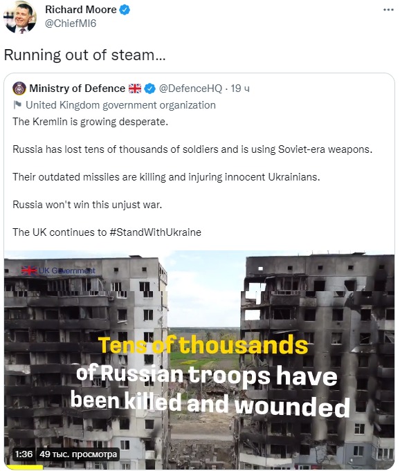 Силы России в Украине выдыхаются, из-за чего отчаяние в Кремле растет. Россиянам не удастся одержать победу в войне, которую они развязали. Об этом сообщил глава британской службы внешней разведки МИ-6 Ричард Мур в Twitter.