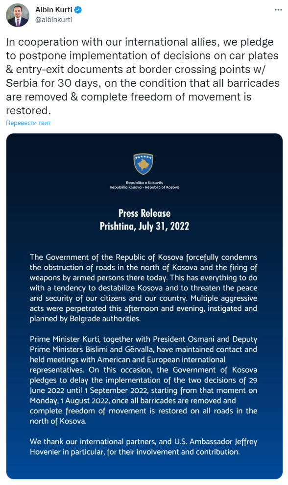 "В сотрудничестве с нашими международными союзниками мы обязуемся отложить исполнение решений по автомобильным номерным знакам и документам на въезд-выезд в пунктах пересечения границы с Сербией на 30 дней при условии, что все баррикады будут разобраны и будет восстановлена полная свобода передвижения", - сообщил Курти.