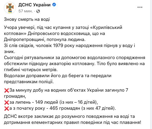 Всего за минувшие сутки на водоемах Украины погибли семеро граждан, а в целом за прошедший июль - 149 человек. Из них - 16 детей.