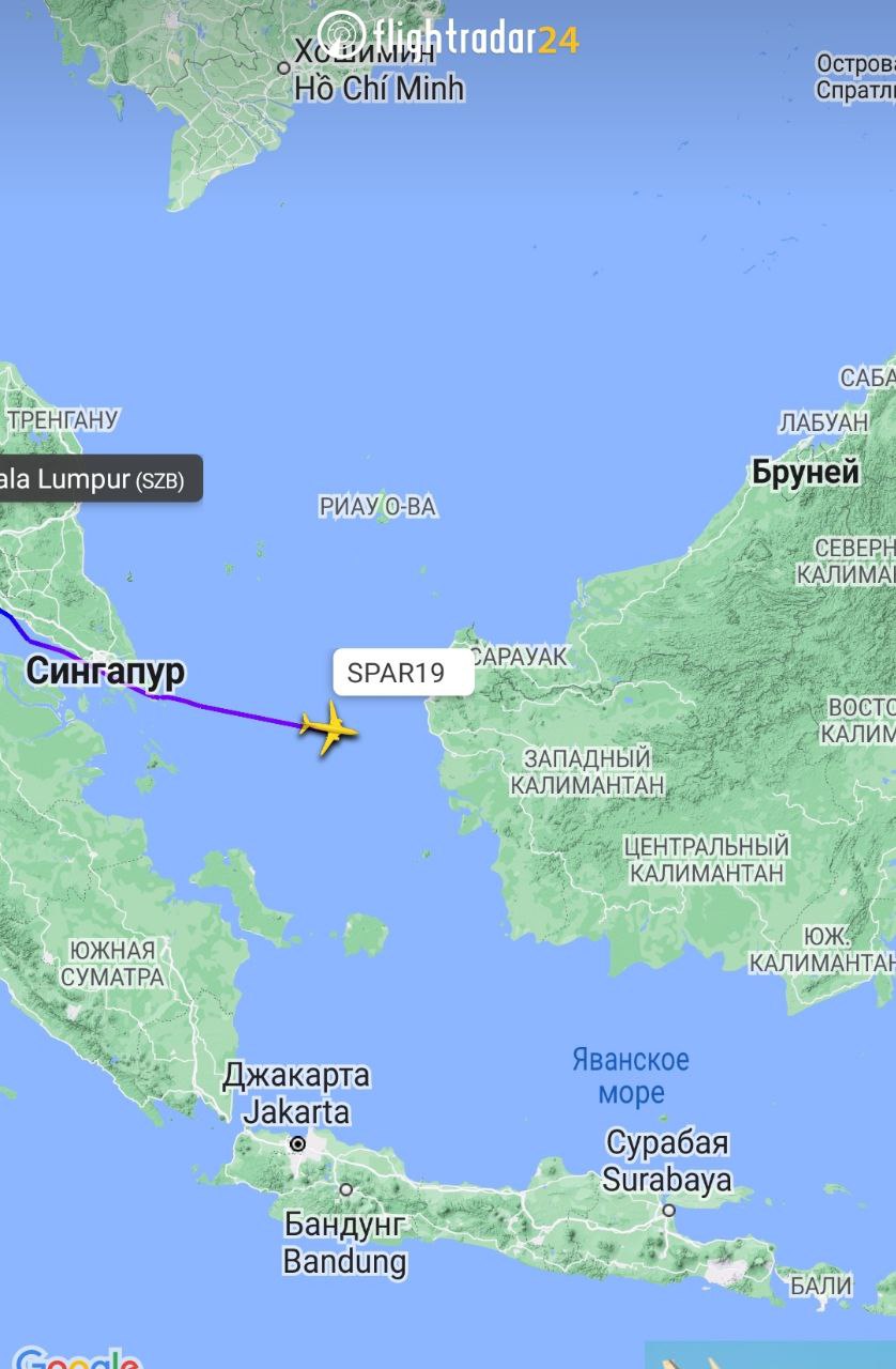 Тем временем сервисы, позволяющие наблюдать за передвижениями воздушных судов, сообщают, что самолёт Пелоси уже покинул Малайзию и приближается к острову Борнео.