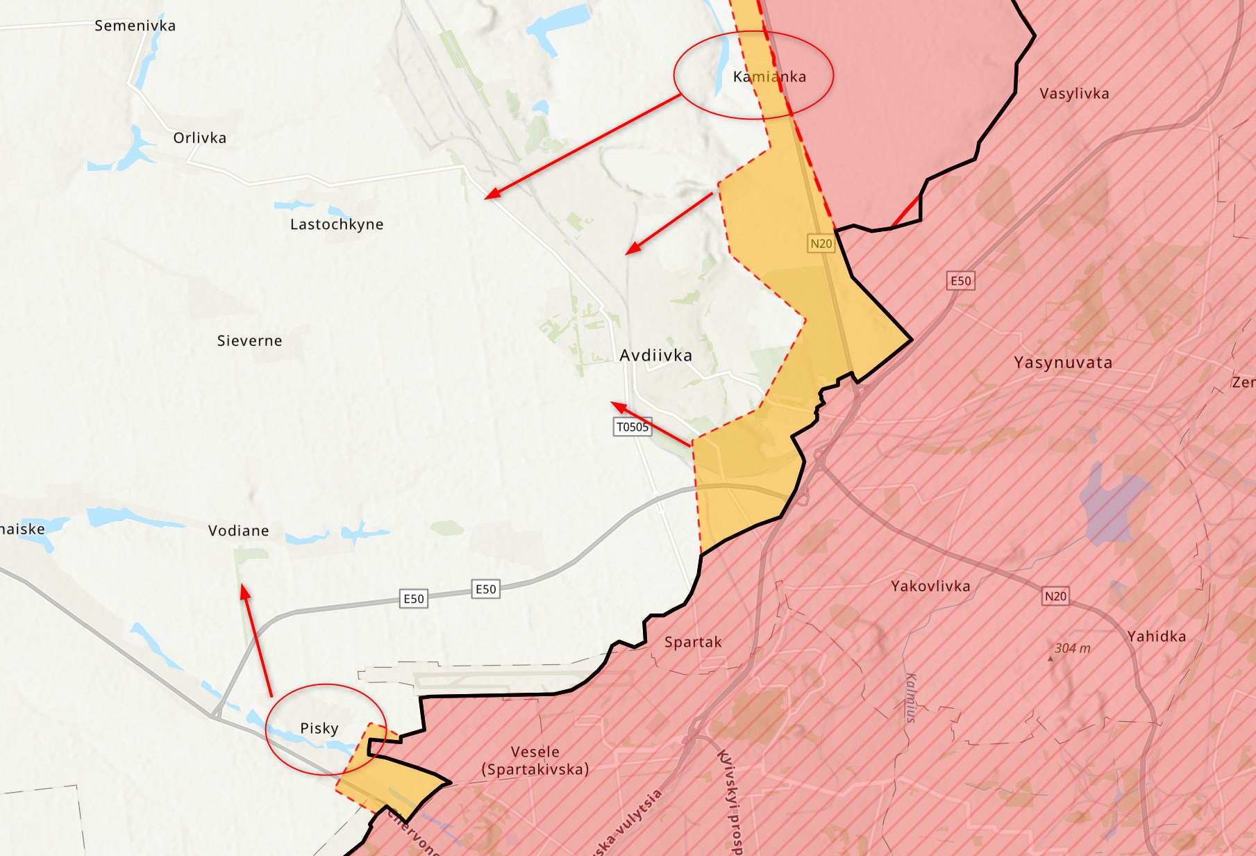 Причем явно виден замысел более далекого охвата - через Пески с юга и Каменку с севера (со стороны трассы на Константиновку), где может быть попытка отрезать дорогу на Орловку, через которую снабжается Авдеевка (предполагаемые направления обозначены стрелками).