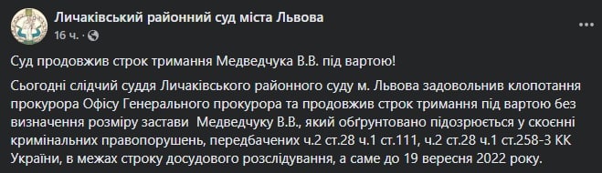 Лычаковский райсуд Львова продлил арест подозреваемого в госизмене Виктора Медведчука до 19 сентября. Возможность внесения залога не предусмотрена.