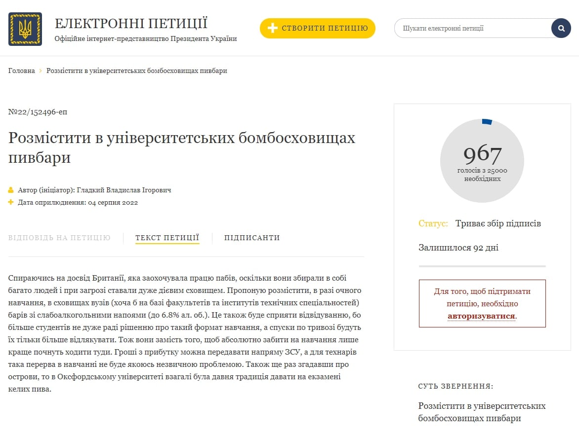 Украинцы создали на сайте президента петицию, в которой предлагают разместить в бомбоубежищах университетов пивбары.