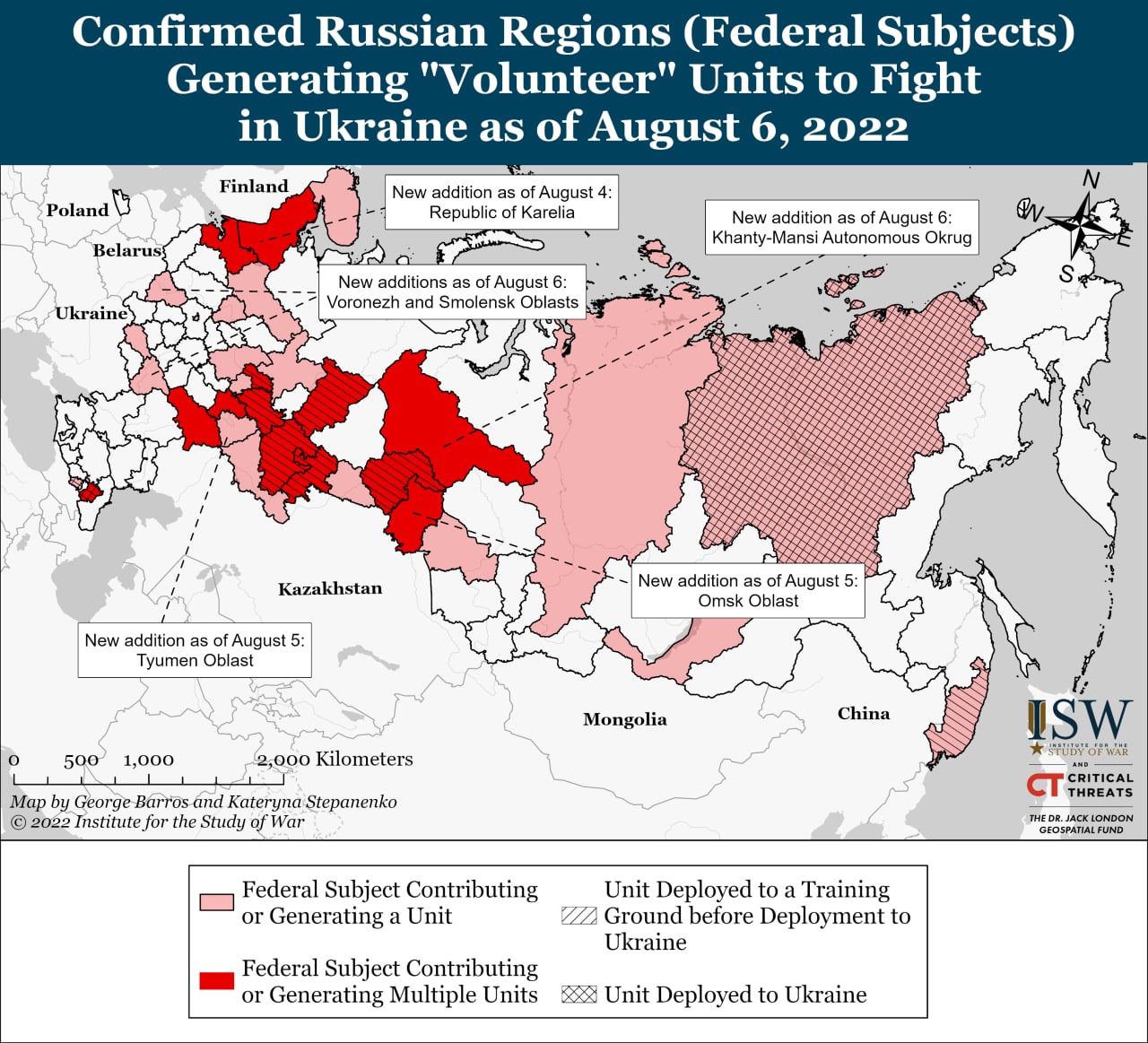 07:51 "Институт изучения войны" публикует карту российских регионов, где подтверждено формирование добровольческих соединений для войны в Украине: Ингушетия, Дагестан, Ставропольский и Красноярский край.