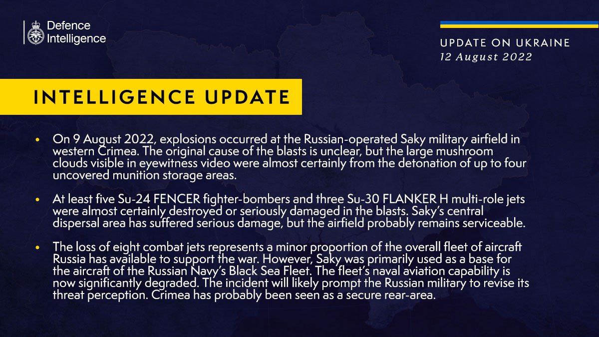 08:46 По данным британской разведки, в Крыму были уничтожены или серьезно повреждены не менее пяти истребителей Су-24 и трех многоцелевых самолетов Су-30.